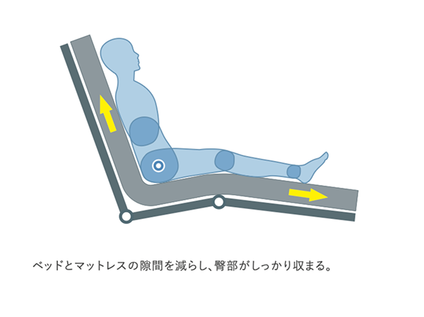 電動ベッドの動きに追従することで身体がずれにくく、より自然な姿勢で背をあげることができます。